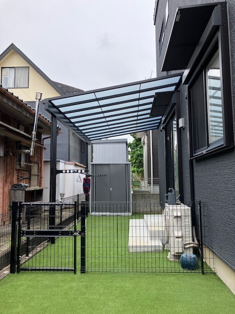 屋根と柵を設置してペットが安心して走り回れる空間になり、飼い主様も大満足